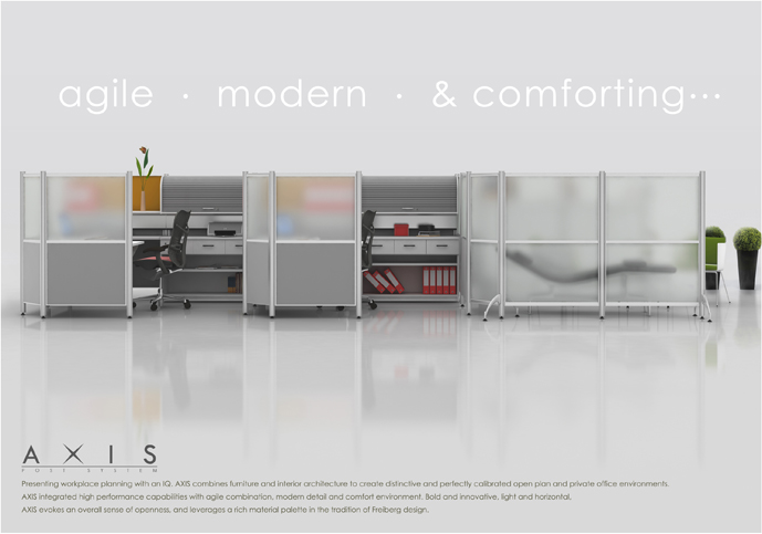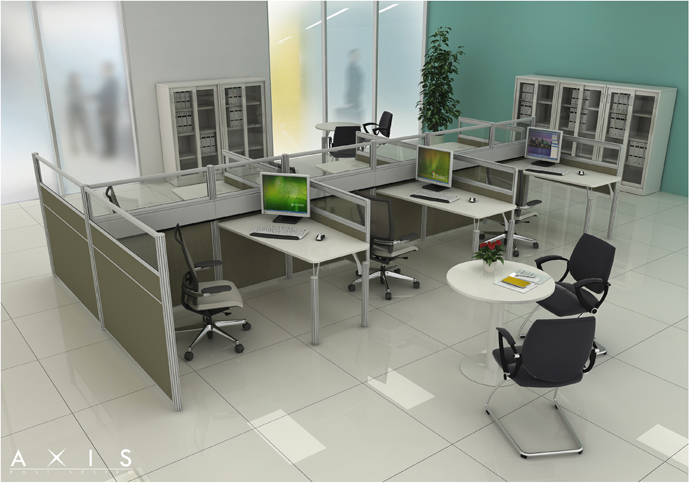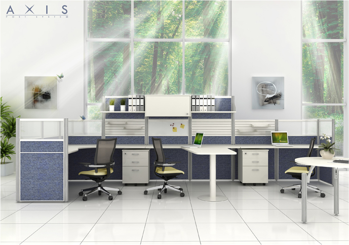 aXis unique 12 ways structural post supports, interlocking screens, radial feet, beams and work surfaces, this allows for any configuration, size and height of workstation or furniture to be created. Inventory includes curved polyprolylene, full height, fabric, timber, half and fully glazed, pinnable and airflow screens, white and magnetic boards. aXis is able to be flat packed for economical shipping. Installation and construction are a simple matter of cutting-to-length and screwing together with Allen key and Phippips screwdriver. |